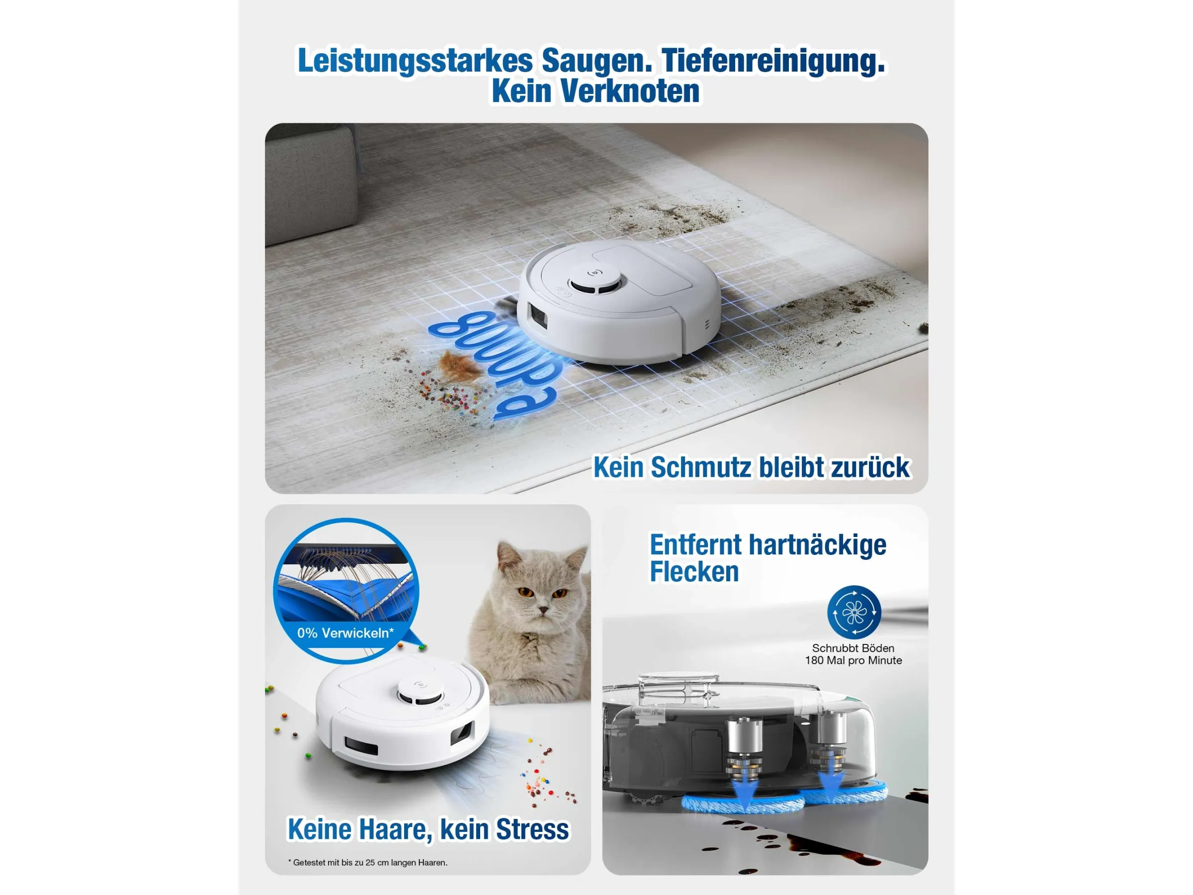 Die Kombination aus starker Saugleistung und optimierter Bürstenstruktur verhindert, dass Haare sich stark verfangen. Dies reduziert den Reinigungsaufwand zusätzlich.