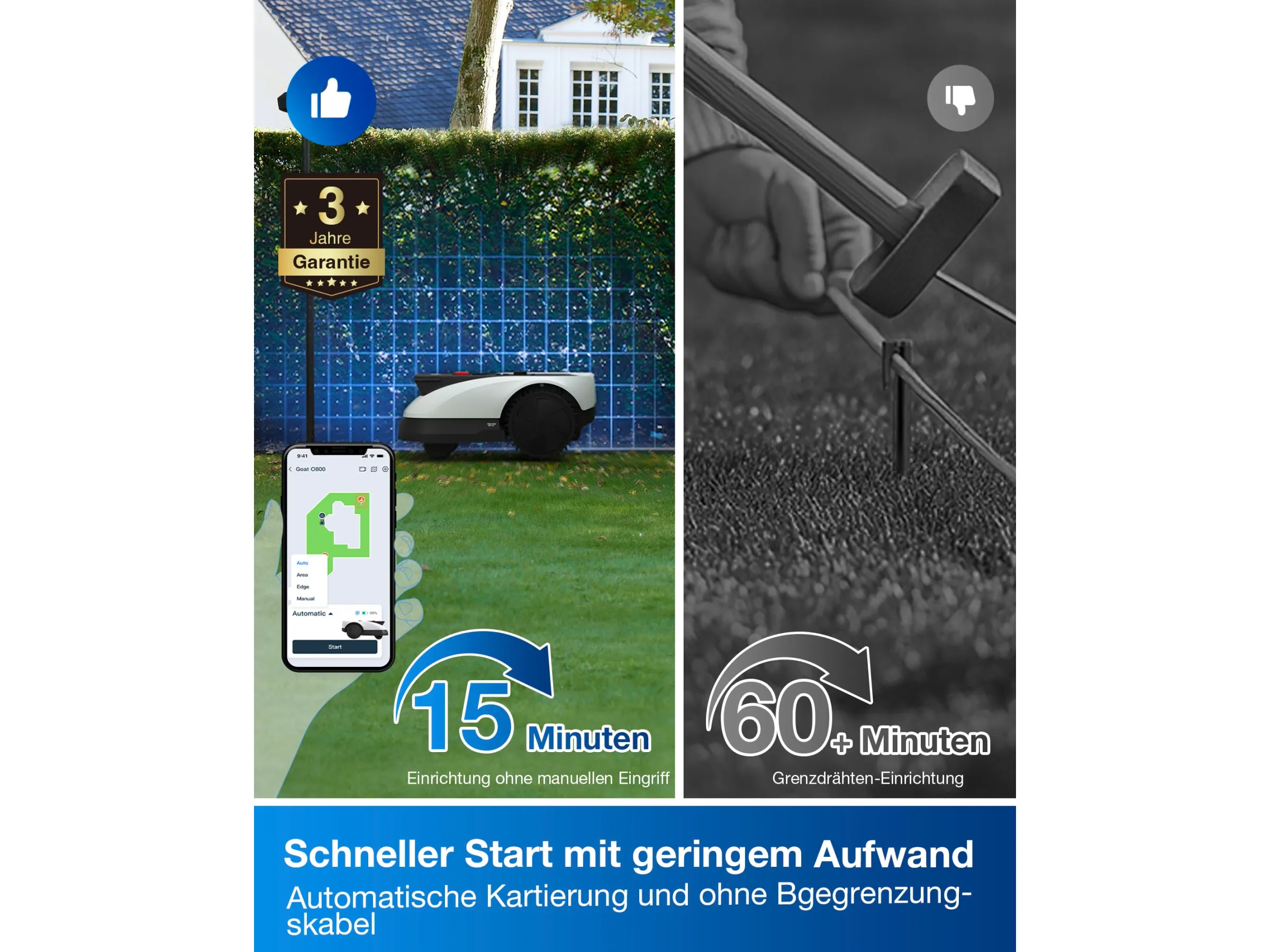 Ein wesentlicher Vorteil moderner Mährobotik liegt in der einfachen Installation ohne Begrenzungskabel. Der Ecovacs Mähroboter Goat A1600 RTK nutzt virtuelle Grenzen, die bequem per App festgelegt werden können.