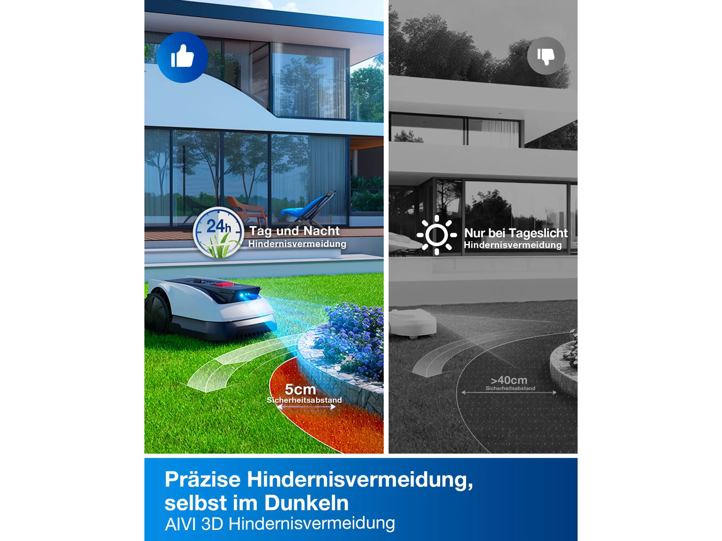 Moderne Sensorik ermöglicht eine zuverlässige Erkennung von Hindernissen wie Bäumen, Gartenmöbeln oder Spielgeräten. Der Mähroboter reagiert vorausschauend und passt seine Route entsprechend an.